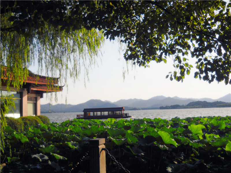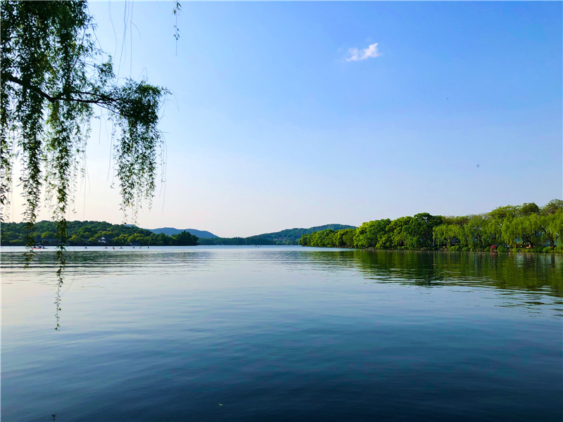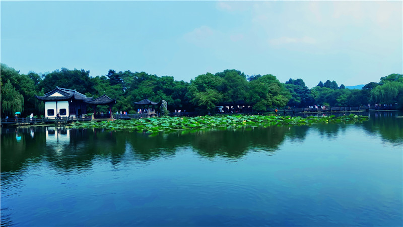 杭州西湖雨后湖面平静,清澈湖面显示绿草倒影图片